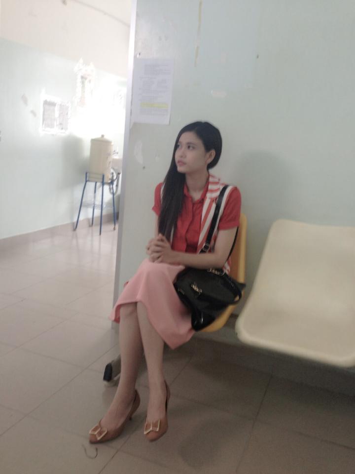 Trương Quỳnh Anh với khuôn mặt buồn, ngồi ghế chờ với